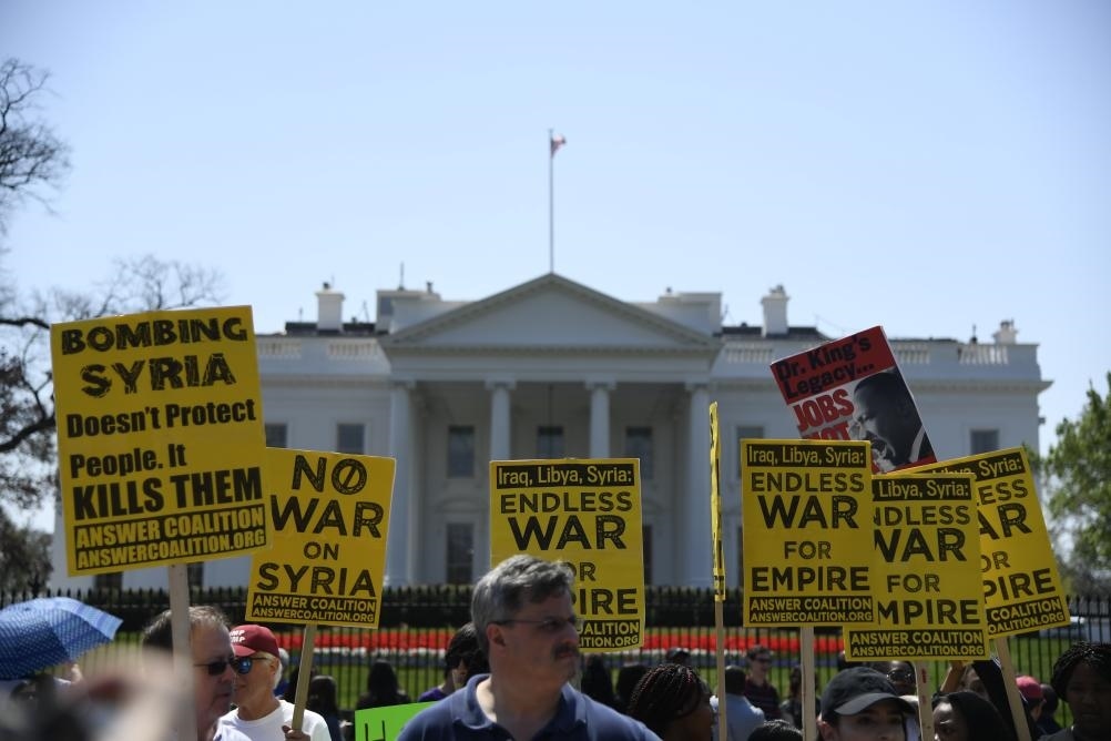 2018年4月14日,在美國華盛頓白宮北側(cè),人們手持標(biāo)語抗議對敘利亞進(jìn)行軍事打擊。新華社記者楊承霖攝