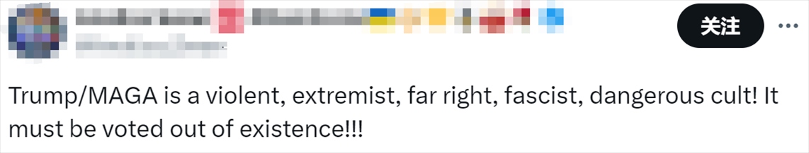 有人喊話:“特朗普/MAGA(即讓美國再次偉大口號)是一個暴力的、極端的、極右翼的、法西斯的、危險的邪教!一定要用投票讓它不復(fù)存在?。?!”