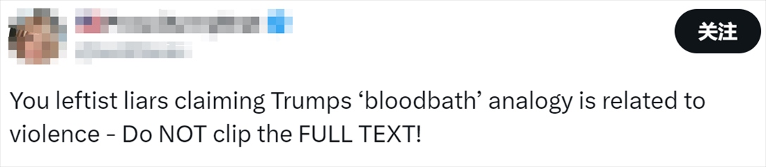 另一方面,一些特朗普的支持者則抨擊民主黨人斷章取義。有人說:“你們這些左翼(民主黨)聲稱特朗普的‘屠殺’與暴力有關(guān)——別斷章取義!”