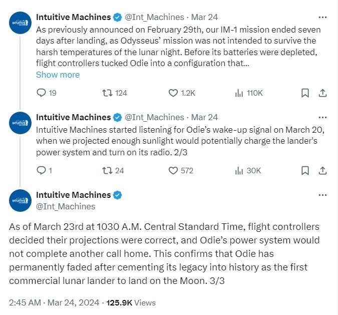 “經(jīng)過數(shù)天等待,已確認(rèn)‘奧德修斯’電力系統(tǒng)已不能支持它再次完成通信,”聲明寫道?!斑@證實(shí)‘奧德修斯’作為首個(gè)由私營(yíng)企業(yè)發(fā)射的月球著陸器永久休眠?!?/p>
