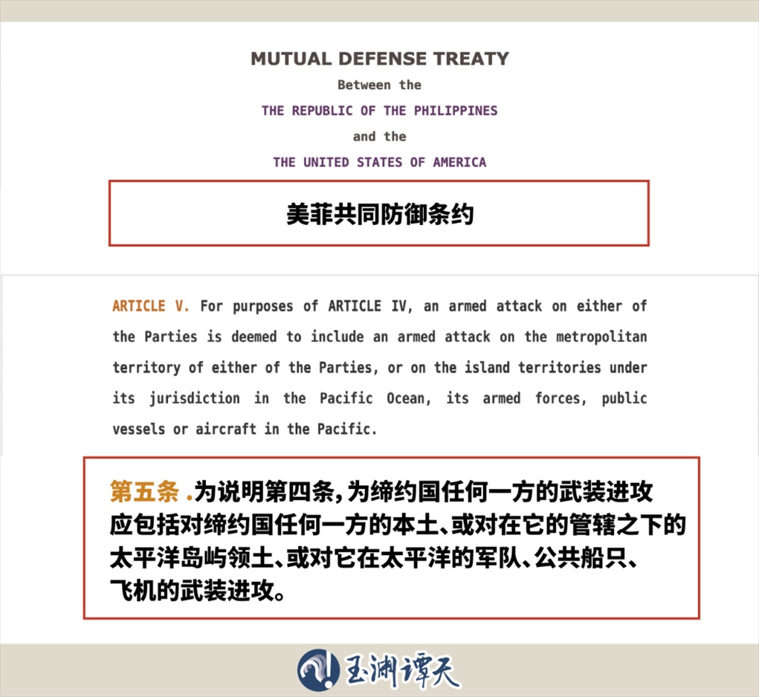 “……該條約延伸到在太平洋(包括南海任何地方)對(duì)菲律賓武裝部隊(duì)、公共船只或飛機(jī)(包括其海岸警衛(wèi)隊(duì)的船只或飛機(jī))的武裝攻擊……”