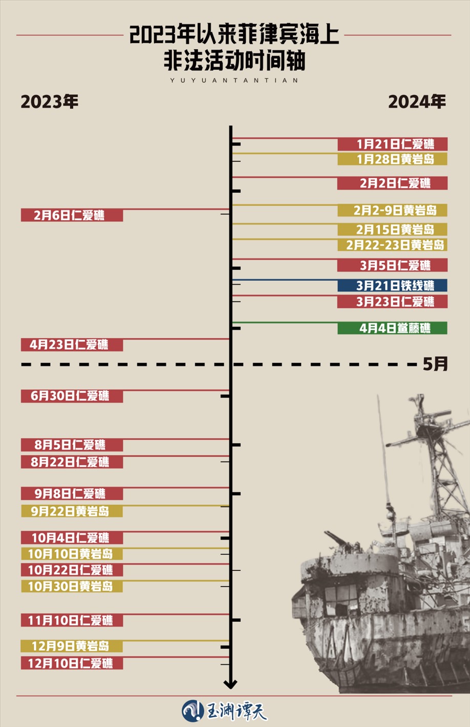 這是2023年以來(lái),菲律賓在南海挑釁滋事的時(shí)間線,可以看到,在防務(wù)準(zhǔn)則更新后,菲律賓在南海挑釁滋事的頻次驟增。