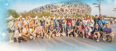 在北京國家體育場(chǎng)外,馬斯卡廷中學(xué)師生合影留念。