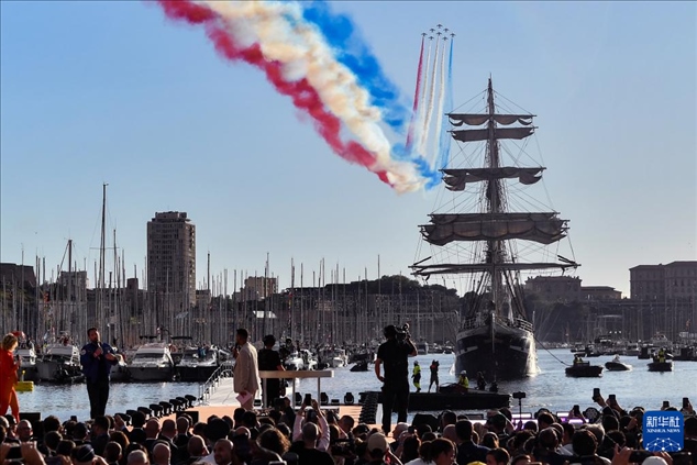 傍晚時(shí)分,伴隨著現(xiàn)場(chǎng)觀眾高唱法國國歌《馬賽曲》,“貝勒姆”號(hào)緩緩駛進(jìn)港口,著名的“法蘭西巡邏兵”飛行表演隊(duì)從港口上空呼嘯而過,先后展示了奧運(yùn)五環(huán)與法國國旗的圖案。
