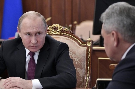 2019年2月2日,在俄羅斯莫斯科,俄羅斯總統(tǒng)普京(左)會(huì)晤國防部長紹伊古和外交部長拉夫羅夫(不在畫面中)。新華社/衛(wèi)星社