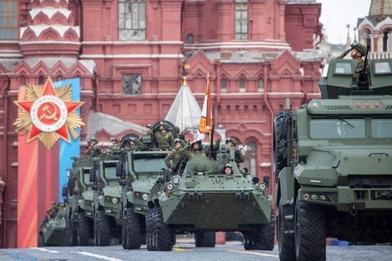 5月9日,在俄羅斯首都莫斯科,軍車編隊(duì)駛過紅場。新華社記者曹陽攝