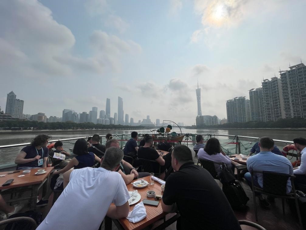 4月15日,采購商從入住的白天鵝賓館乘坐定制接駁交通船前往第135屆廣交會(huì)場(chǎng)館。新華社記者霍思穎攝