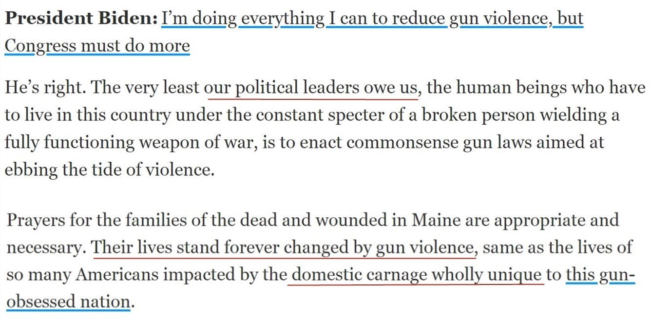文章指出,正是因?yàn)榭駸岬膿順屌珊蛧?guó)會(huì)中的立法者與槍支制造商的利益緊密相連,很多美國(guó)人的生活都被槍支暴力改變了,這是“美國(guó)這個(gè)槍支泛濫之國(guó)獨(dú)有的國(guó)內(nèi)殺戮”。