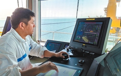 工作人員在“新海鯊”輪駕駛艙操作設(shè)備。本報記者 管克江攝