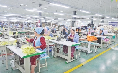 中泰新絲路塔吉克斯坦農(nóng)業(yè)紡織產(chǎn)業(yè)園成衣車間的工人們正在制作服裝。本報記者 曲 頌攝