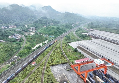 6月27日,西部陸海新通道中老泰馬跨境鐵路班列在重慶江津小南埡站發(fā)車(無(wú)人機(jī)照片)。該班列的開行將促進(jìn)通道沿線地區(qū)與東盟國(guó)家的經(jīng)貿(mào)合作和產(chǎn)業(yè)聯(lián)動(dòng)。新華社記者 唐 奕攝