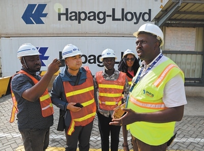 中加兩國(guó)媒體記者在特馬新集裝箱碼頭采訪工作人員。本報(bào)記者 張志文攝