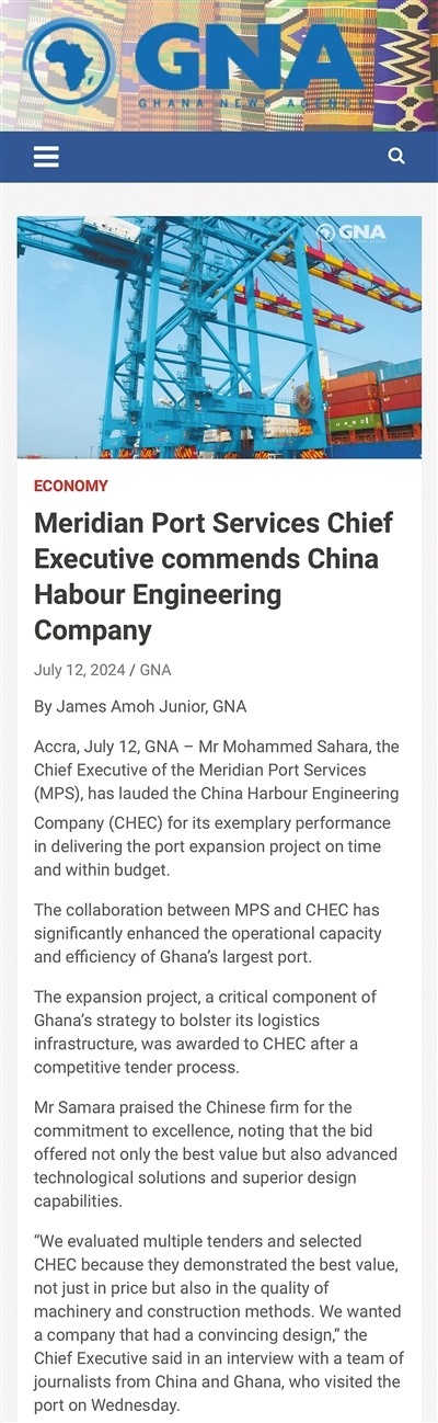 中國(guó)港灣為港口擴(kuò)建項(xiàng)目提供了先進(jìn)的技術(shù)解決方案和卓越的設(shè)計(jì)能力,并引入了多項(xiàng)創(chuàng)新技術(shù),包括能夠減少港口擁堵的停泊位窗口計(jì)劃,以及用于跟蹤和管理貨運(yùn)的先進(jìn)數(shù)字系統(tǒng),贏得了港口業(yè)主加納子午線港口服務(wù)有限公司高度肯定?!约蛹{通訊社報(bào)道