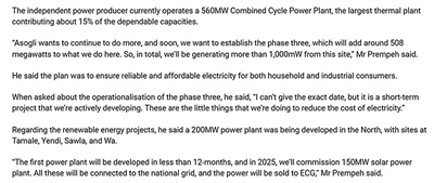 深能安所固投資建設(shè)運(yùn)營(yíng)的聯(lián)合循環(huán)發(fā)電廠裝機(jī)容量560兆瓦,并計(jì)劃在未來通過擴(kuò)建工程提升至超1000兆瓦,為當(dāng)?shù)丶彝ズ凸I(yè)消費(fèi)者提供可靠且負(fù)擔(dān)得起的電力供應(yīng)。加中兩國(guó)員工在電廠運(yùn)營(yíng)中密切合作,新入職的加納員工會(huì)配有一名中國(guó)導(dǎo)師,還可以通過參加培訓(xùn)提升職業(yè)技能?!约蛹{通訊社報(bào)道