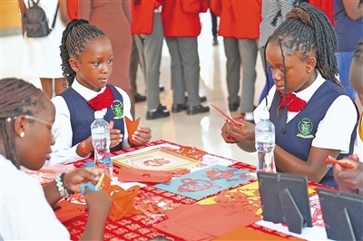 今年2月,在肯尼亞內(nèi)羅畢大學(xué)孔子學(xué)院舉辦的2024“歡樂春節(jié)之龍騰鼓躍鬧新春”活動上,當(dāng)?shù)貙W(xué)生體驗中國剪紙。本報記者 黃煒鑫攝