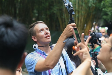 俄羅斯《俄羅斯報(bào)》視覺內(nèi)容編輯阿爾圖爾·杰魯諾夫在拍攝熊貓。(李佩藺 攝)