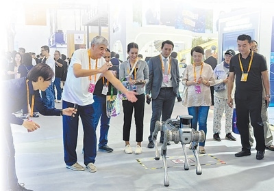 在服貿(mào)會(huì)現(xiàn)場(chǎng),智能機(jī)器狗吸引很多關(guān)注。本報(bào)記者 劉玲玲攝