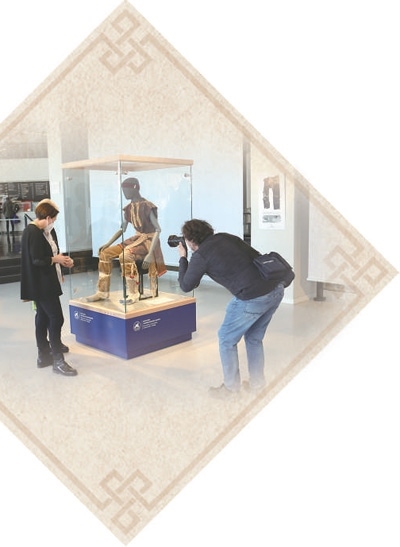 加入科研團(tuán)隊(duì)的德國(guó)服裝設(shè)計(jì)師卡特琳·迪爾斯娜第一次接觸古代服飾文物,但多年來為歷史題材電影和戲劇制作服飾的經(jīng)驗(yàn)對(duì)她很有幫助。此次全套服裝包括素絹高領(lǐng)短衫、粉色拼接藍(lán)色羊毛束口長(zhǎng)褲、與長(zhǎng)褲同色系的羊毛短靴(靴口為素絹)、素色絲質(zhì)裹身半裙、裝飾與配色同樣考究的套頭長(zhǎng)袍,以及下緣綴有風(fēng)琴褶的淺金拼淡玫紅色絲質(zhì)大衣——經(jīng)過科學(xué)復(fù)原,古代服飾的時(shí)尚審美與紡織技藝令人嘆服,衣物主人的綽約風(fēng)姿也穿越千年風(fēng)沙,宛在眼前?!翱吹竭@些服裝一件件穿在真人模特身上,完美地隨身搖擺,我被深深打動(dòng)。那一刻,我和2000多年前的人與物情感相連,感受相通?!钡蠣査鼓日f。