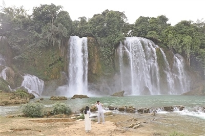從越南首都河內驅車往東北方向行駛400多公里,一路經過星羅棋布的稻田,越過連綿不絕的原始叢林和崇山峻嶺,最終抵達高平省重慶縣潭水鄉(xiāng)歸春河畔,就能看到著名的中越德天(板約)跨國瀑布(見圖二,本報記者楊曄攝)。10月14日,中越德天(板約)瀑布跨境旅游合作區(qū)宣布正式投入運營,成為中國首個跨境旅游合作區(qū)。近日,本報記者到此進行了實地探訪。