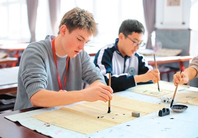 圖為活動(dòng)期間,來(lái)自美國(guó)得克薩斯州圣史蒂芬圣公會(huì)學(xué)校的學(xué)生查爾斯·錢寧·達(dá)根(左)在河北衡水中學(xué)學(xué)習(xí)書法。
