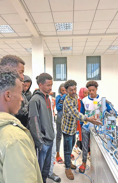 埃塞俄比亞魯班工坊當(dāng)?shù)亟處煘閷W(xué)生們講解機(jī)電一體化設(shè)備的操作方法。