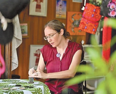 謝敏來自美國芝加哥,曾是一名英語老師的她,如今稱自己為設(shè)計(jì)師、小店店主。謝敏的小店叫“海島樂趣”,位于海南??诎咨抽T公園內(nèi)?!斑@是五指山市的黎錦手提包,這是保亭村子里的織品,那幾件是東方市的?!钡昀飻[放的黎錦作品出自海南各地村民之手,謝敏如數(shù)家珍。店中還有不少她親手設(shè)計(jì)和制作的文創(chuàng)產(chǎn)品,靈感都來自魚、烏龜、閃電等傳統(tǒng)黎錦紋樣。