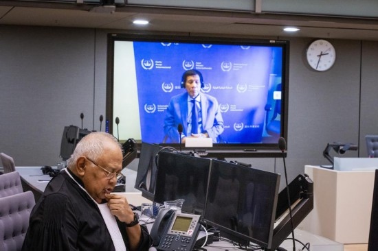 這是3月14日在荷蘭海牙拍攝的國際刑事法院第一預審庭現場,菲律賓前總統杜特爾特以視頻連線方式出席。新華社發(fā)(國際刑事法院供圖)