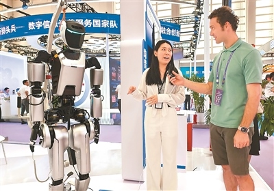 在浙江省寧波國際會(huì)展中心的第十四屆智博會(huì)現(xiàn)場,一位外國朋友采訪人形機(jī)器人展商。