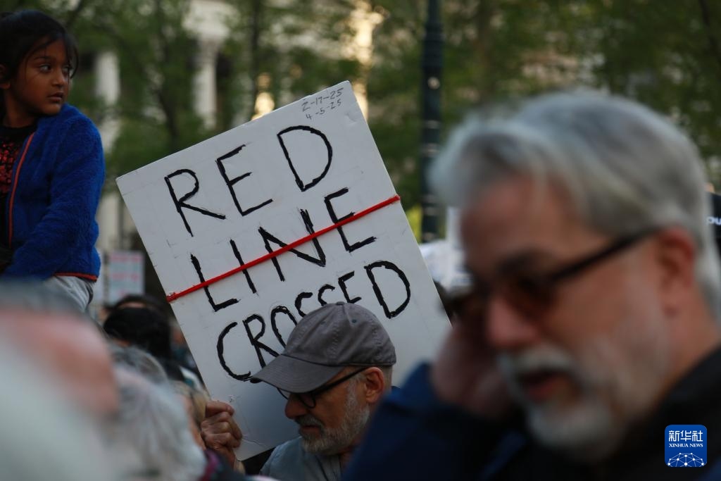 5月1日,人們手持標(biāo)語在美國紐約參加抗議特朗普政府政策的集會和游行。新華社記者 劉亞南 攝