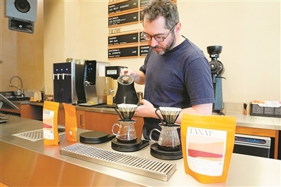 法國知名精品咖啡烘焙品牌TANAT今年推出兩款產自云南保山紅龍莊園的小??Х犬a品。該品牌首席烘焙師托馬·克萊芒表示,所選的云南咖啡豆口感柔和細膩,兼具豐富的層次與地域特色。圖為該品牌位于巴黎的一家門店內,咖啡師在沖泡云南咖啡。