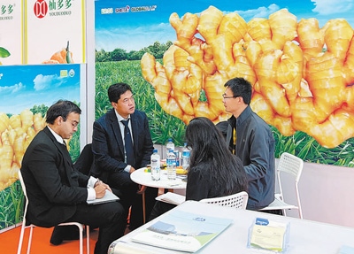 在2025年德國柏林國際果蔬展覽會上,山東省三慧食品有限公司工作人員向當地客商推介安丘大姜。