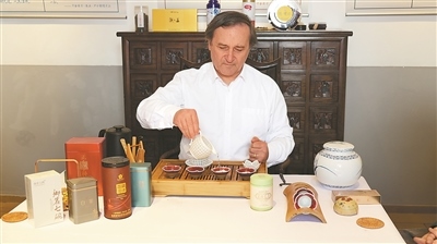 品茶已經成為許多意大利人的日常生活習慣。意大利茶業(yè)與花草茶協會主席馬可·貝托納十分喜愛中國茶,并收藏有正山小種、普洱茶等多種中國名茶。圖為馬可·貝托納在展示茶藝。
