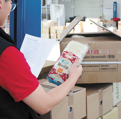 圖為東方超市員工在清點剛運抵貨運中心的龍口粉絲。作為中國最早與歐盟互認的地理標志產品之一,龍口粉絲一直深受德國顧客的青睞。
