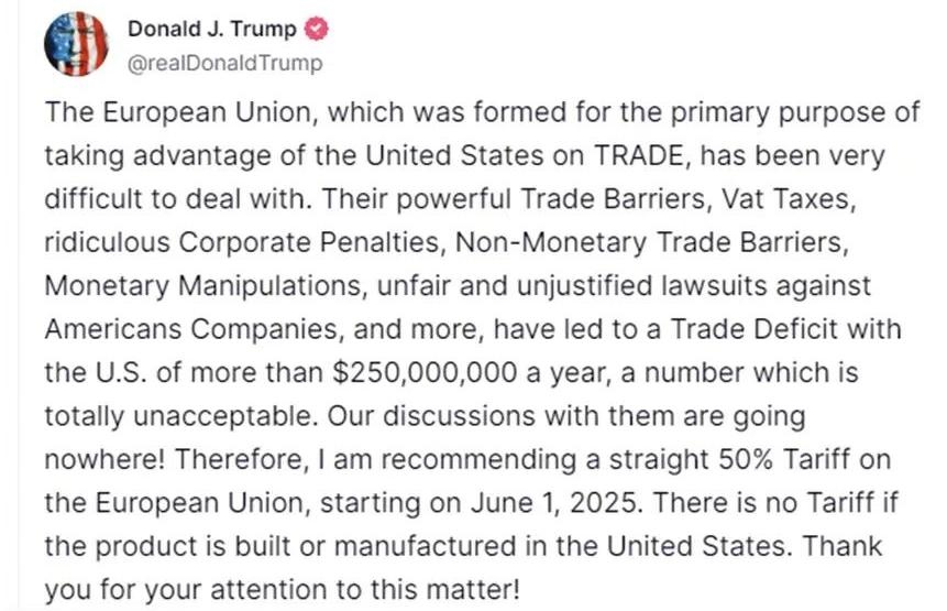 他說,美歐之間的磋商停滯不前?!耙虼?,我建議自2025年6月1日起,對歐盟商品統(tǒng)一征收50%關(guān)稅。若產(chǎn)品在美國本土生產(chǎn)制造,則免征關(guān)稅。”