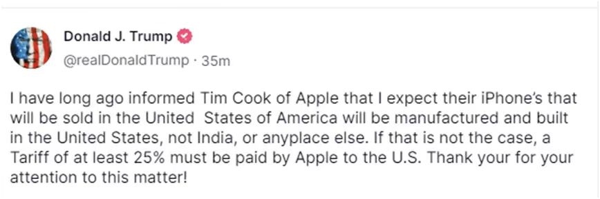 針對蘋果,特朗普說,他“很早之前就告訴過蘋果公司的(首席執(zhí)行官)蒂姆·庫克,我希望他們在美國銷售的蘋果手機是在美國生產(chǎn)和制造,而不是在印度或者其他什么地方”,“如果不是這樣的話,蘋果公司必須向美國支付至少25%的關(guān)稅”。