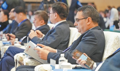 與會嘉賓在2025上合組織國家媒體合作論壇上,閱讀《共同的家園——上合組織成員國發(fā)展愿景民意調查報告》。