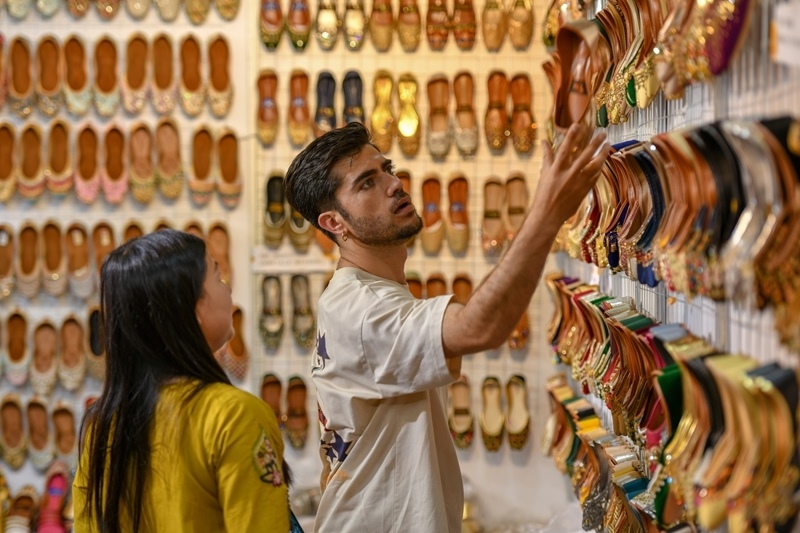 2025年6月19日,在第9屆中國—南亞博覽會(huì),巴基斯坦展區(qū)的參展商(右)向一名顧客推介特色鞋。新華社發(fā)(彭奕凱 攝)