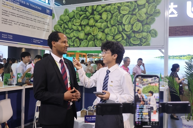 2025年6月14日,在第四屆中國-非洲經(jīng)貿(mào)博覽會(huì)上,埃塞俄比亞駐華公使內(nèi)比尤·穆罕穆德參加現(xiàn)場直播帶貨。新華社記者 周昊瑾 攝