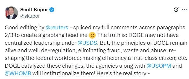 庫(kù)珀表示,“政府效率部”或許不再會(huì)有“集中化的領(lǐng)導(dǎo)”,但其工作準(zhǔn)則將繼續(xù)保留:減少章程架構(gòu);減少欺詐、浪費(fèi)和濫用;重塑聯(lián)邦人力結(jié)構(gòu);將效率放在首位等等。“政府效率部”催動(dòng)了相關(guān)變革,美國(guó)人事管理局、白宮管理和預(yù)算辦公室一起將其制度化,“這才是真相”。