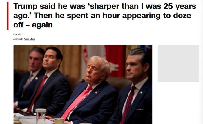 美國有線電視新聞網(CNN)注意到,當美國商務部長盧特尼克談及貿易戰(zhàn)時,特朗普“似乎難以睜開眼睛”。在美國教育部長麥克馬洪和美國衛(wèi)生與公眾服務部長小羅伯特·肯尼迪發(fā)言時,特朗普“似乎僵住了,閉著眼睛,每次持續(xù)10到15秒,然后才轉動眼球或點頭”。