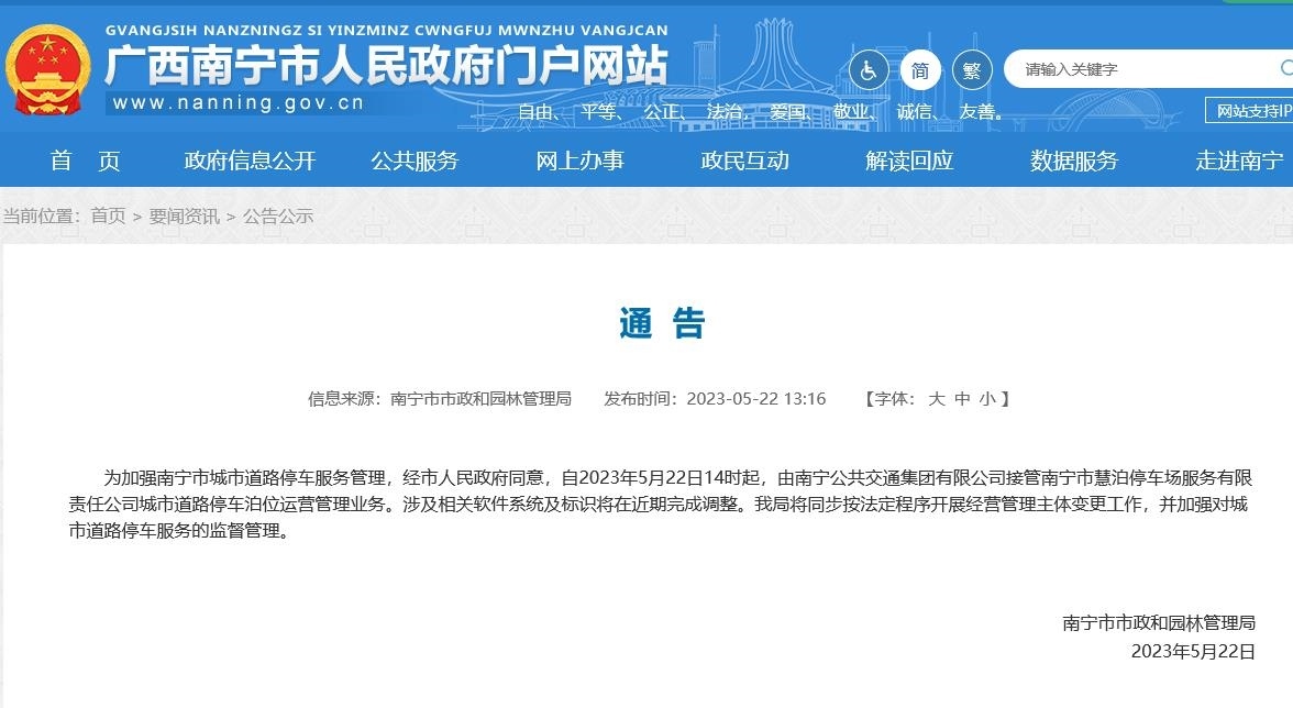 5月22日14時(shí)起 南寧公交集團(tuán)接管慧泊停車運(yùn)營(yíng)管理業(yè)務(wù) 經(jīng)市人民政府同意,自2023年5月22日14時(shí)起,由南寧公共交......
