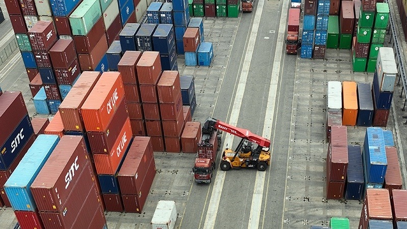 2023年2月15日,工人在廣西欽州港集裝箱碼頭駕駛裝卸車調(diào)運(yùn)集裝箱(無人機(jī)照片)。
