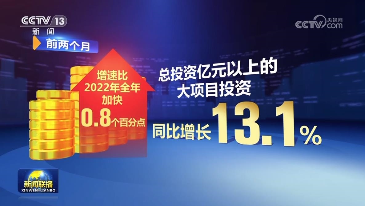 前兩個月,全國固定資產(chǎn)投資同比增長5.5%,增速比2022年全年明顯加快,其中,總投資億元以上的大項(xiàng)目投資同比增長13.1%,增速比2022年全年加快0.8個百分點(diǎn)。