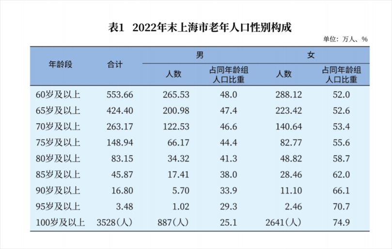 統(tǒng)計數(shù)據(jù)顯示,2022年上海戶籍人口1505.19萬人。60歲及以上老年人口553.66萬人,占總?cè)丝诘?6.8%;65歲及以上老年人口424.40萬人,占總?cè)丝诘?8.2%;70歲及以上老年人口263.17萬人,占總?cè)丝诘?7.5%;80歲及以上高齡老年人口83.15萬人,占60歲及以上老年人口的15.0%,占總?cè)丝诘?.5%;100歲及以上老年人口3528人,其中男性887人,女性2641人。