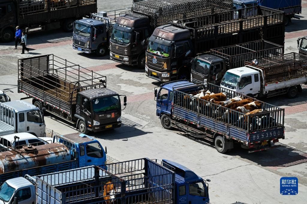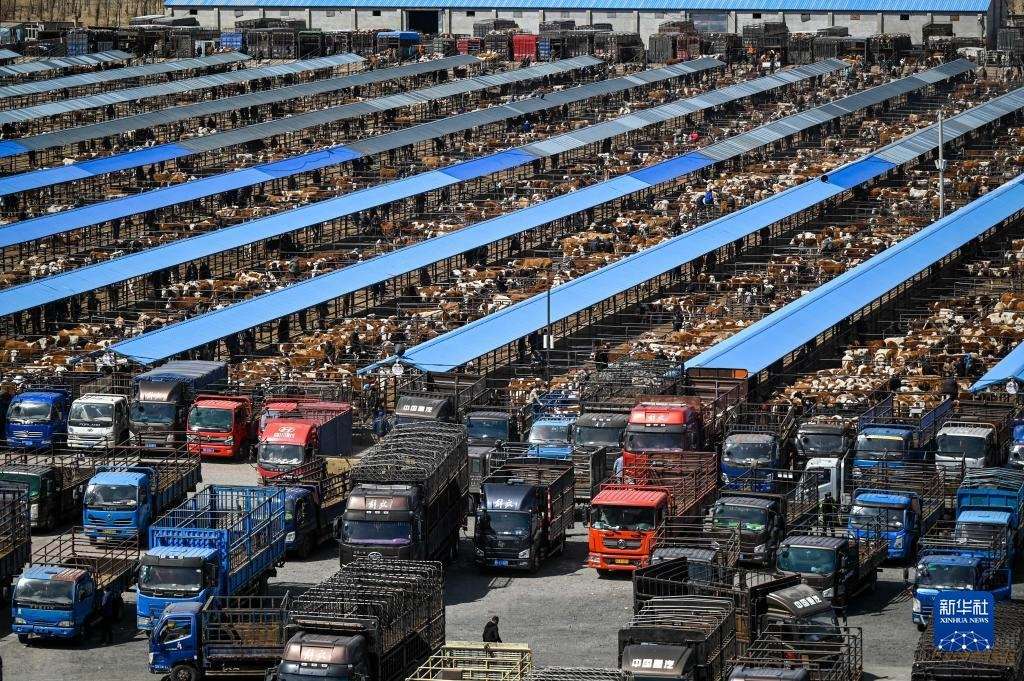 4月12日,內(nèi)蒙古通遼市科爾沁左翼中旗舍伯吐鎮(zhèn)成峰牲畜交易市場(chǎng)里一片繁忙景象,1000余輛貨運(yùn)車整齊排列,1萬(wàn)余頭黃牛正等待被交易。據(jù)介紹,這個(gè)交易市場(chǎng)年交易80萬(wàn)頭肉牛,交易額可達(dá)80億元。今年以來(lái),當(dāng)?shù)嘏J行星橹饾u轉(zhuǎn)好,來(lái)自遼寧、吉林、山東等地的買家再次聚集于此,帶動(dòng)了養(yǎng)殖戶增收。新華社記者 連振 攝