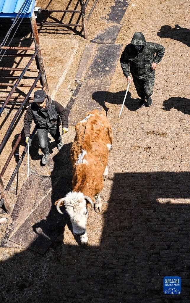4月12日,賣家在成峰牲畜交易市場(chǎng)趕牛。