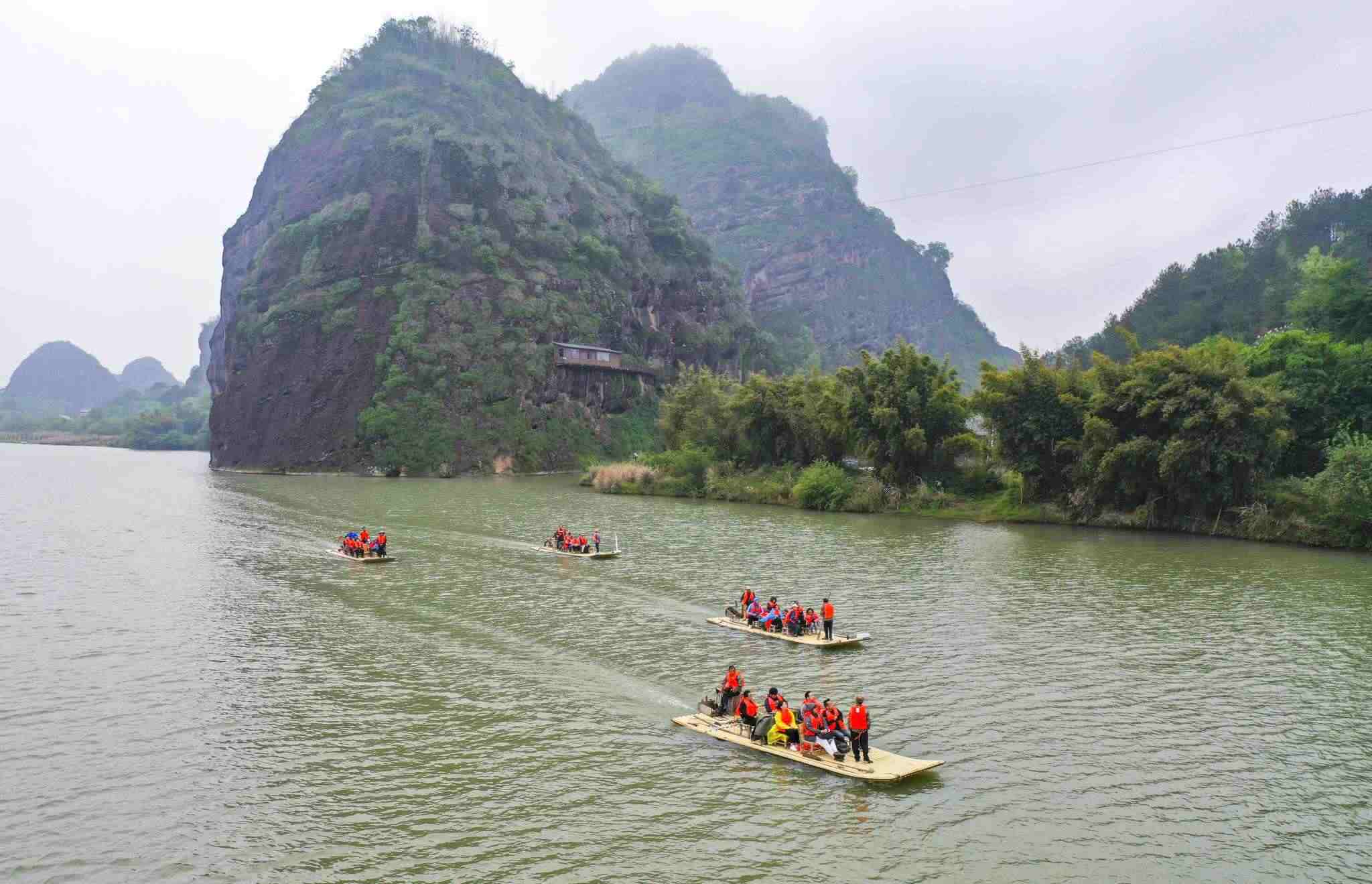 2023年4月13日,江西鷹潭,龍虎山景區(qū),游客們乘坐竹筏觀光賞景。視覺中國