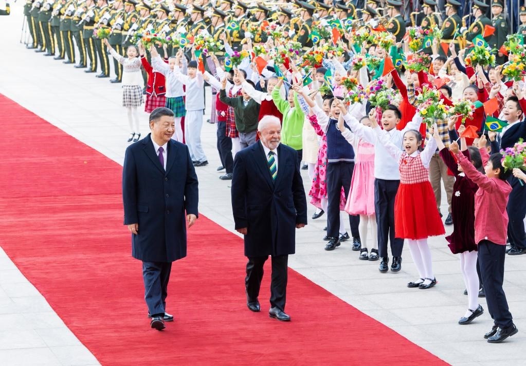 4月14日下午,國(guó)家主席習(xí)近平在北京人民大會(huì)堂同來(lái)華進(jìn)行國(guó)事訪問(wèn)的巴西總統(tǒng)盧拉舉行會(huì)談。這是會(huì)談前,習(xí)近平在人民大會(huì)堂東門(mén)外廣場(chǎng)為盧拉舉行歡迎儀式。新華社記者 黃敬文 攝