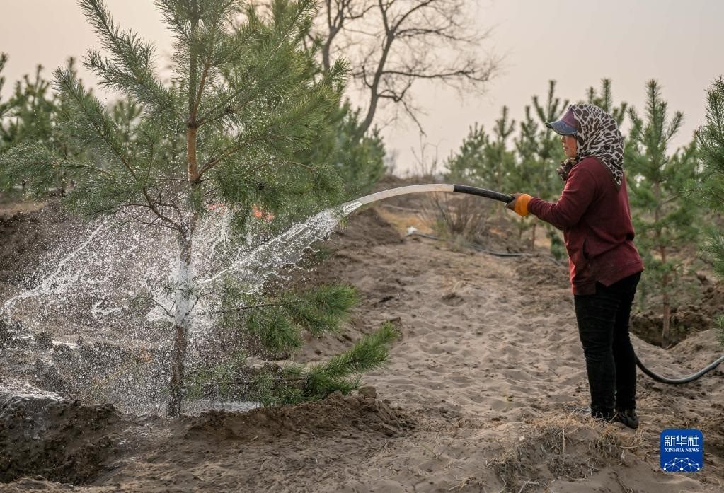 4月15日,在內(nèi)蒙古通遼市科爾沁左翼后旗,治沙工人在科爾沁沙地給樹木澆水。