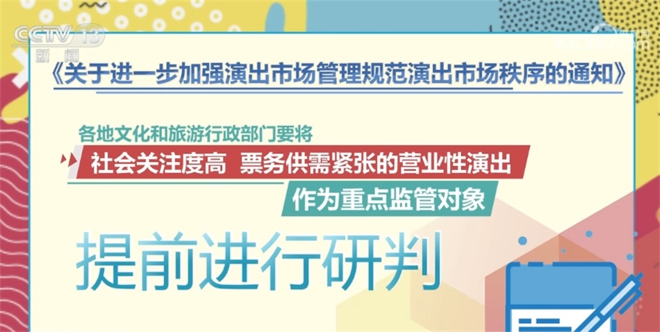 通知指出,各地文化和旅游行政部門要依法做好演出活動的審批工作,將屬于營業(yè)性演出范圍的農(nóng)村集鎮(zhèn)演出、流動性演出納入審批管理,嚴(yán)格審核演出舉辦單位的資質(zhì)文件,統(tǒng)一審批要求,做好內(nèi)容監(jiān)管。對不符合法定審批要求的,堅(jiān)決不予批準(zhǔn)。文化和旅游行政部門要定期對演出場所進(jìn)行檢查,督促演出場所定期開展設(shè)施設(shè)備檢查,落實(shí)安全生產(chǎn)責(zé)任制。督促演出場所建立完善現(xiàn)場巡查制度,指定專人負(fù)責(zé)演出活動的巡查,做好現(xiàn)場觀眾管理,堅(jiān)決防止擁擠、踩踏等事故發(fā)生,確保演出現(xiàn)場安全。各地文化和旅游行政部門要將社會關(guān)注度高、票務(wù)供需緊張的營業(yè)性演出作為重點(diǎn)監(jiān)管對象,提前進(jìn)行研判。督促演出舉辦單位、演出票務(wù)經(jīng)營單位面向市場公開銷售的營業(yè)性演出門票數(shù)量,不得低于核準(zhǔn)觀眾數(shù)量的70%。對在票務(wù)經(jīng)營中發(fā)現(xiàn)有炒票問題或可能造成不良影響的,應(yīng)當(dāng)及時(shí)約談演出舉辦單位和演出票務(wù)經(jīng)營單位,督促整改。要聯(lián)合屬地公安、市場監(jiān)管等部門,依法打擊“黃?!背雌?、虛假宣傳等違法違規(guī)行為,切實(shí)保障消費(fèi)者合法權(quán)益。